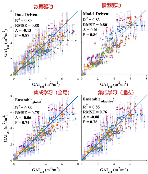 图2. 数据驱动、模型驱动和集成学习方法估算的小麦GAI验证结果。不同颜色的点代表不同试验站点的数据,本研究共有来自中国和法国12个试验站点的356个地面实测数据。