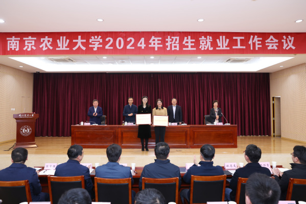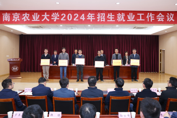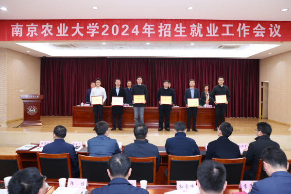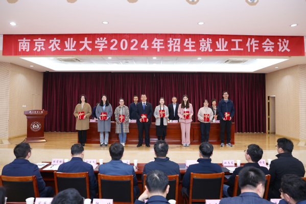 吴荣顺宣读表彰决定。农学院、植物保护学院、食品科技学院、理学院、生命科学学院、信息管理学院6个学院荣获“2023年度招生工作先进单位”,信息管理学院南京宣传小组等16个小组获评“招生工作先进宣传小组”,于佳琪等66人荣获“招生工作先进个人”称号,杨应响等28人荣获“招生工作优秀校友”称号。植物保护学院、动物医学院、食品科学技术学院、农学院、动物科技学院、资源与环境科学学院6个学院获评“2023年度就业工作先进单位”,动物医学院、资源与环境科学学院获评“毕业生深造工作先进单位”,丁静等29人荣获“就业工作先进个人”称号。