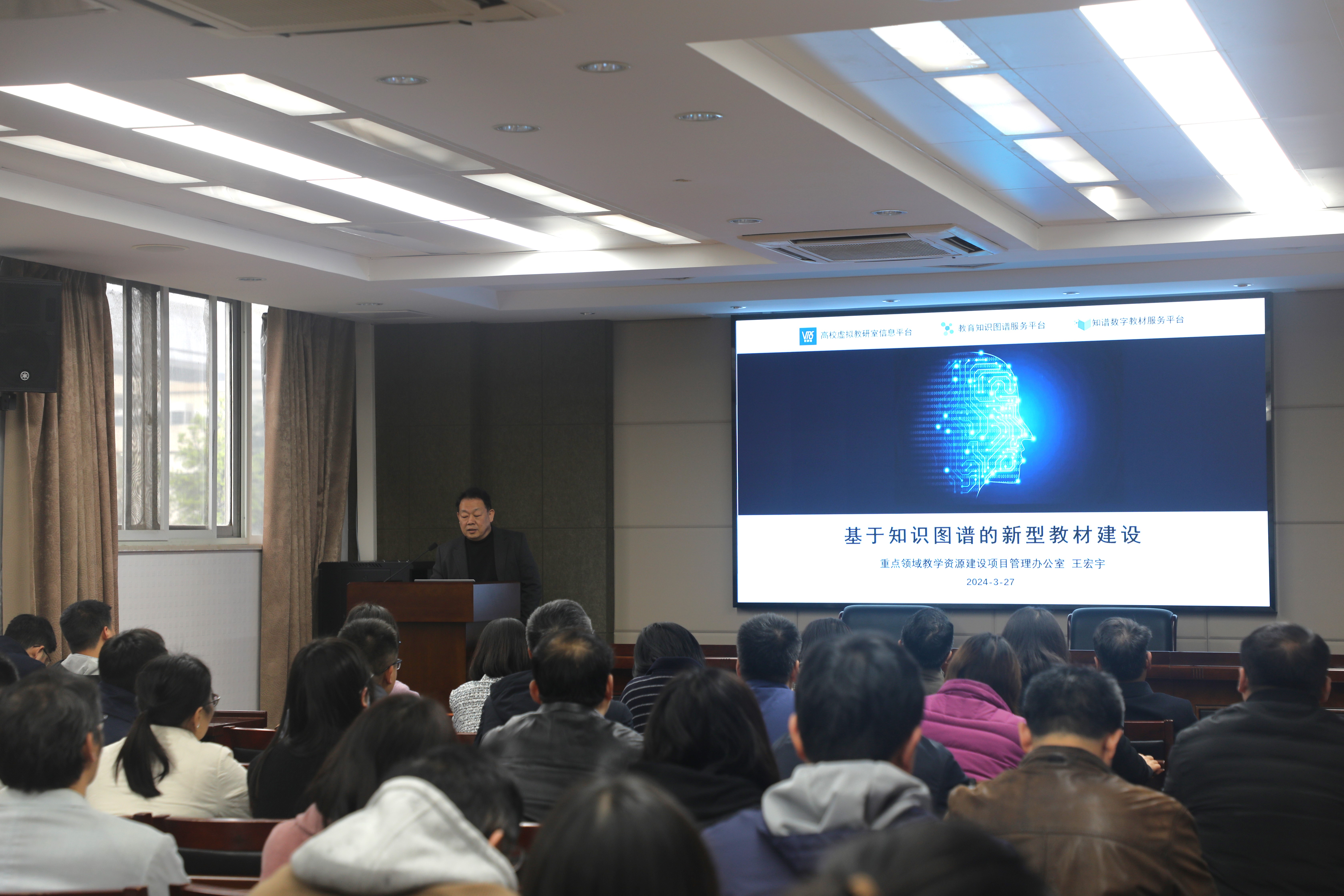 会上,重点领域教学资源建设项目管理办公室主任王宏宇做了题为《基于知识图谱的新型教材建设》的专题讲座。他从“十四五”教育变革主要方向和主要特征出发,介绍了国家教育数字化战略行动的背景,讲解了教育知识图谱的涵义及其构建流程,在此基础上深入探讨了基于知识图谱的新型教材建设的研究与实践。中国农业出版社、北京理工大学出版社、科学出版社以我校《农业植物病理学》《信息资源管理》教材为示范,介绍了数字教材的优势,提供了数字教材建设方案,同时从出版社视角出发分享了数字化教材发展的最新动态及趋势,为学校及主编的数字教材建设提供思路。
