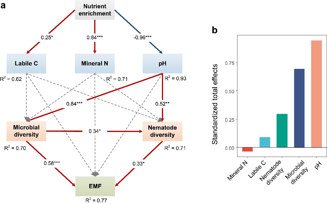 本研究利用位于青藏高原的长期养分(氮磷)添加试验,探索了养分富集影响草地土壤生物多样性和多功能性的机制。发现养分富集增加了可利用的氮磷和植物来源碳,但是降低了土壤pH,并削弱了生物多样性和多功能性之间的关系。进一步分析发现土壤酸化,而非碳和养分可利用性,是影响土壤生物多样性和多样性-功能关系的主要驱动因素。并且,土壤pH的效应会沿着营养级级联上升,影响多功能性(图2)。这些结果不仅证明了土壤酸化在调节养分富集对草地土壤生物群落多样性和多功能性的影响方面发挥着关键作用,而且为有效的养分管理和酸化缓解提供了理论依据。
