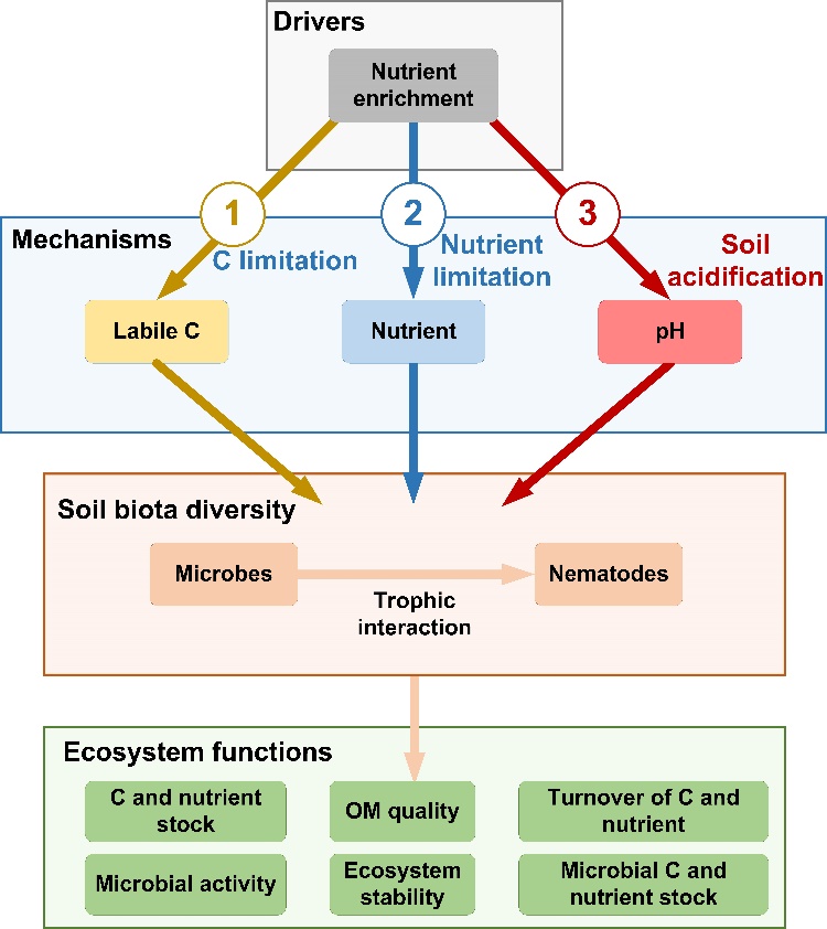 养分富集是最重要的全球环境变化因子之一,但其如何影响土壤生态系统结构与功能尚不清楚。土壤微生物和微型动物(如线虫和原生动物)组成了复杂的土壤微食物网,进而维持生态系统结构和多种生态系统功能(如养分循环、凋落物分解和病害防控等;简称多功能性)。以往绝大多数研究集中于探讨养分富集如何直接影响土壤生物,或通过改变植物生长间接影响土壤生物。而且,这些工作多集中在单一营养级上(single trophic level),很少关注跨营养级(multiple trophic level)互作及其功能后果。养分富集可以通过三个潜在机制影响土壤生物多样性、微食物网结构和多功能性(图1):(1)促进植物生长,增加有机碳输入,刺激微生物生长,并通过捕食关系传递到微食物网高营养级;(2)改变土壤养分化学计量比,增加富营养型土壤生物对其他土壤生物的竞争优势,导致生态系统功能与土壤生物多样性解耦;(3)改变土壤理化环境,特别是引起土壤酸化,从而调控土壤生物多样性,和植物-微生物互作。尽管这三种机制可能单独或共同调控养分富集对土壤生物和功能的影响,它们对生态系统功能的相对贡献尚不明确。