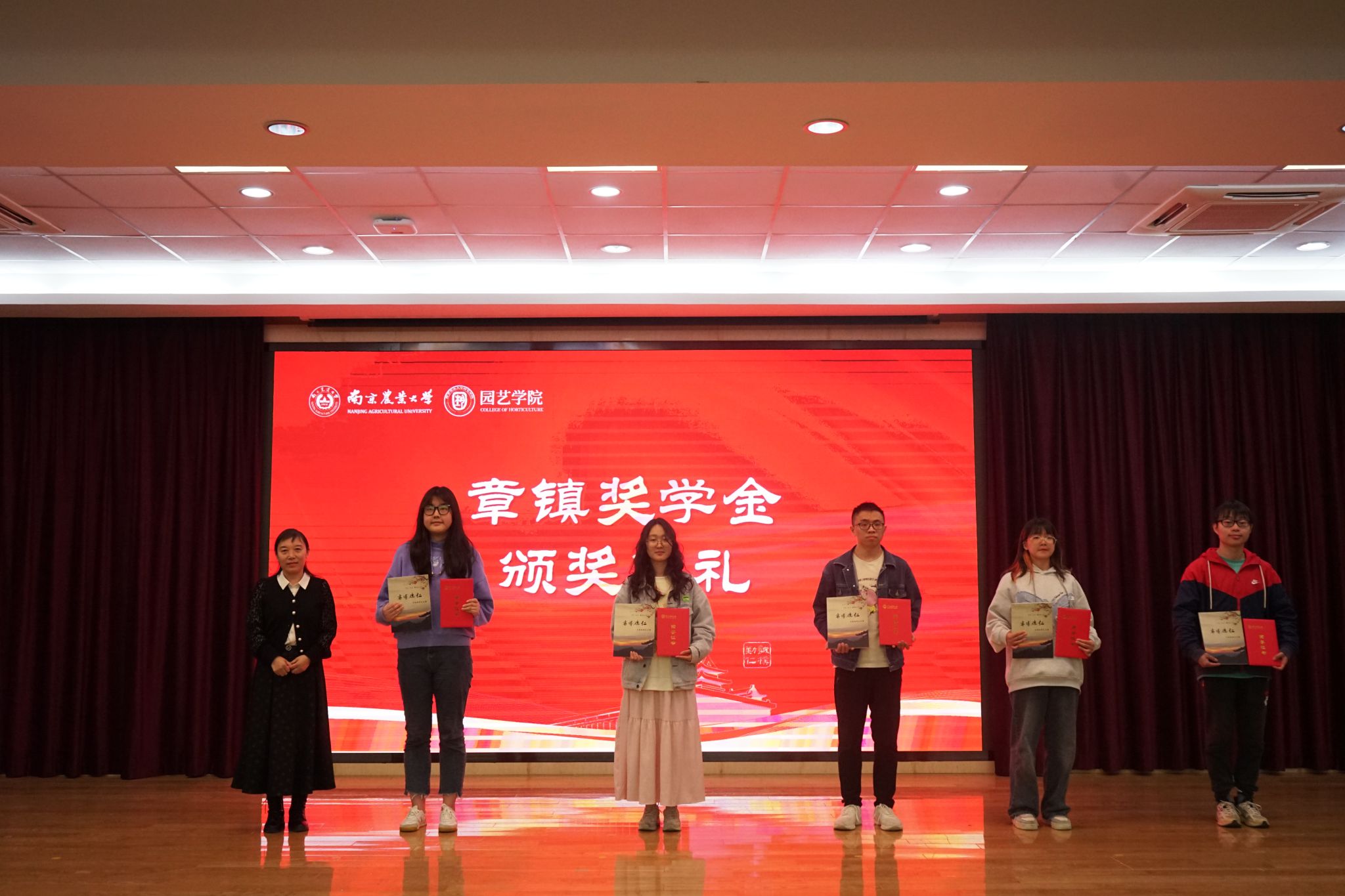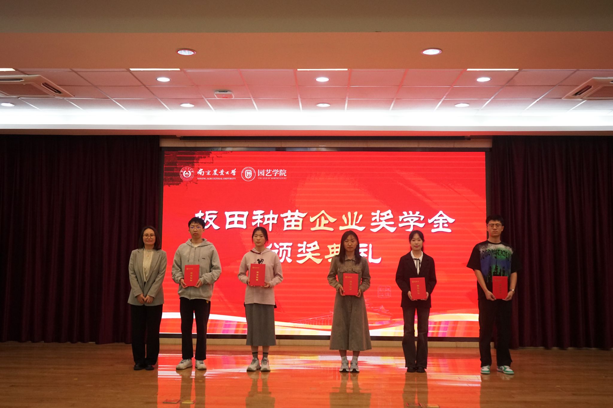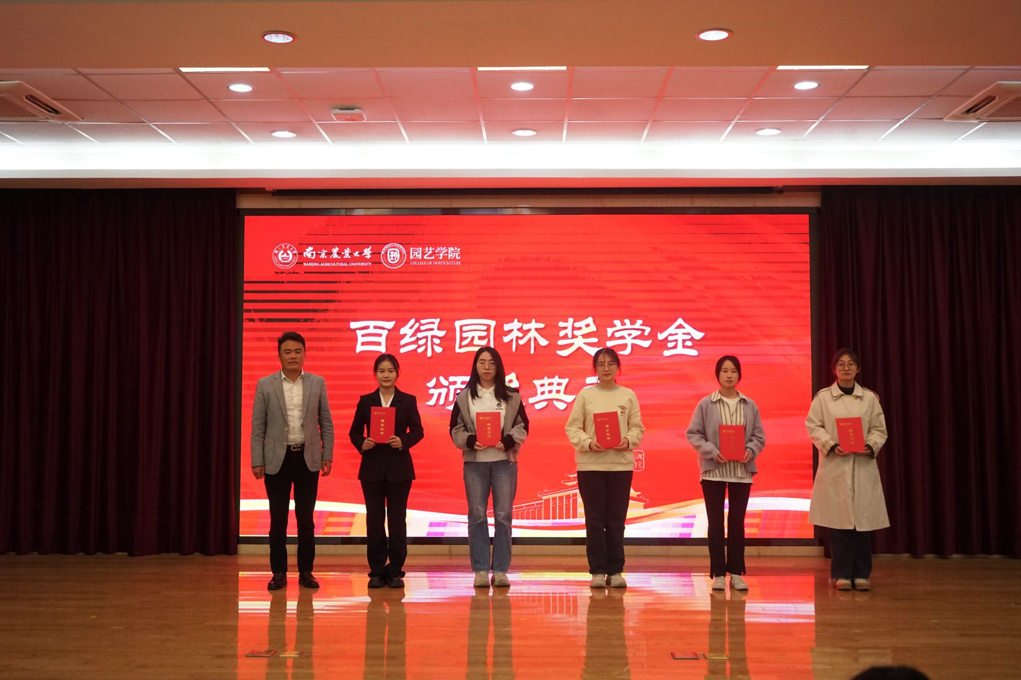 企业及教师代表为获百绿园林奖学金、坂田种苗企业奖学金、章镇奖学金、厚德(于超项目)奖学金、宏旭达园林奖学金、凝心聚力学业奖学金、梦起南源创新创业奖学金的53名学生颁发获奖证书。