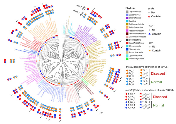 图4. 通过宏基因组分箱获得的组装基因组(MAGs)中携带arsM基因的细菌及在稻田发病与正常区域中arsM转录水平的差异