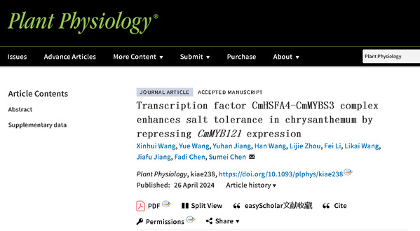 近日,园艺学院菊花遗传与种质创新团队在国际学术期刊Plant Physiology发表了题为“Transcription factor CmHSFA4-CmMYBS3 complex enhances salt tolerance in chrysanthemum by repressing CmMYB121expression”的研究论文,揭示了CmHSFA4-CmMYBS3-CmTPL蛋白复合体通过抑制下游靶基因CmMYB121启动子区乙酰化水平抑制该基因表达,进而正向调控菊花耐盐性的机制。
