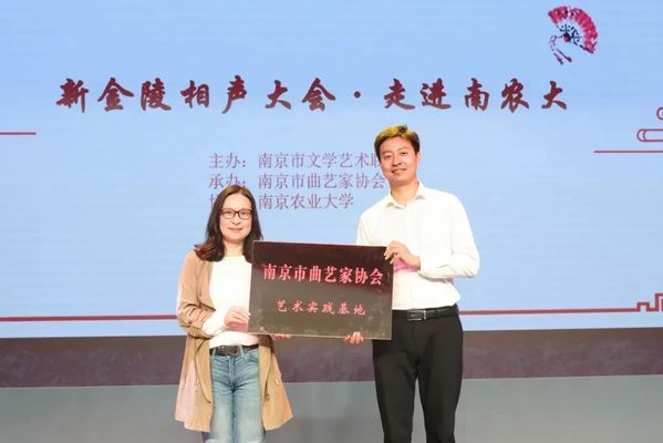 毛敏代表南京市文联向我校颁发了“南京市曲艺家协会艺术实践基地”铭牌。基地的设立,旨在通过相声等曲艺艺术,加强校地融合交流,丰富校园文化,让更多的青年了解、喜爱并传承中华优秀传统文化。