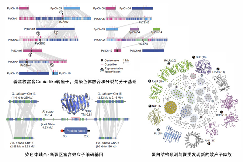 该研究获得了迄今最为完整的大豆疫霉、终极腐霉、寡雄腐霉和刺腐霉等4种卵菌的端粒到端粒(T2T)级基因组组装,发现染色体融合与分裂事件不仅是不同卵菌之间染色体数量变异的主要原因,同时也促进了效应子基因的产生及适应性进化。着丝粒富含Copia-like转座子,是染色体融合和分裂的分子基础。与非融合染色体相比,融合染色体的端粒区有利于基因组的片段复制,也促进了效应子基因的产生、复制与变异。通过对染色体融合/断裂区的搜索,结合高通量蛋白质结构预测与聚类,发现一个卵菌特有的新效应子家族——分泌型含ANK重复结构域蛋白,验证发现其不同成员与病菌的致病性相关。