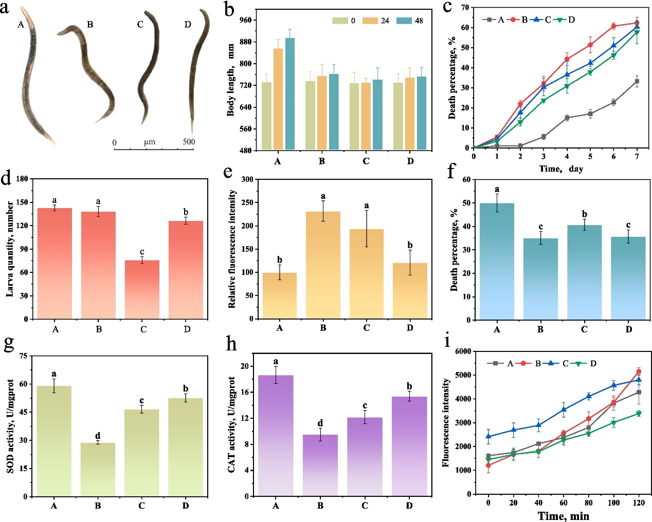 最后,选择模式生物秀丽隐杆线虫(线虫)作为研究对象。结果发现,当线虫暴露于硫苷电解产物中,相比于电解前,其繁殖率、超氧化物歧化酶和过氧化氢酶活力分别提高了63.06%、12.91%和26.28%,致死率、脂褐素和活性氧含量分别降低了26.80%、37.59%和21.31%。这揭示了BDD技术降解菜籽粕硫苷的有效性和潜在应用价值。