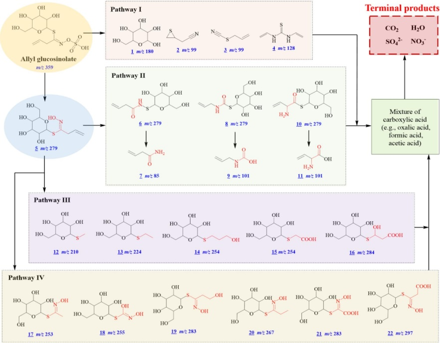 其次,以硫苷家族结构最常见且结构简单的烯丙基硫苷为例。通过结合计算化学和液质分析,提出了烯丙基硫苷在BDD电极上的降解途径,同时计算出了每种产物的急性和慢性毒性。
