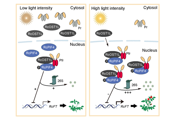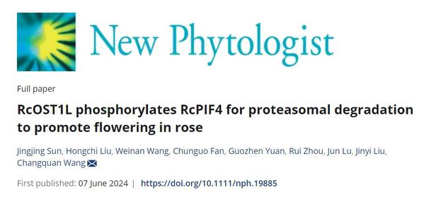 6月7日,ios版雷竞技官网园艺学院王长泉教授团队在New Phytologist杂志发表了题为“RcOST1L phosphorylates RcPIF4 for proteasomal degradation to promote flowering in rose”的研究成果,该研究揭示了RcphyB-RcOST1L-RcPIF4模块响应光强调控月季开花的作用机制,为日中性植物如何在不同光照条件下控制其开花时间提供了分子见解。