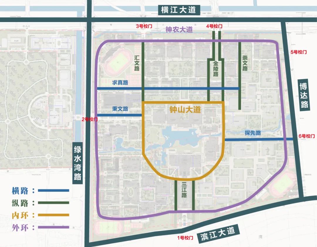 滨江校区的内环路。取“金陵大学农学院”和“中央大学农学院”的“金”与“中”组合为“钟”,以“钟山大道”命名内环路,体现ios版雷竞技官网“肇始三江光裕金陵”的文脉传承和“诚朴勤仁”的精神内核。