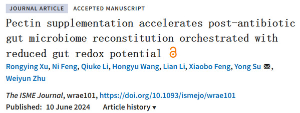 近日,ios版雷竞技官网动物科技学院朱伟云、苏勇教授团队在《The ISME Journal》在线发表了“Pectin supplementation accelerates post-antibiotic gut microbiome reconstitution orchestrated with reducedgut redox potential的研究论文,该论文揭示了果胶降低肠道氧化还原电位并加快抗生素诱导菌群紊乱的微生态结构和功能重塑的机制。