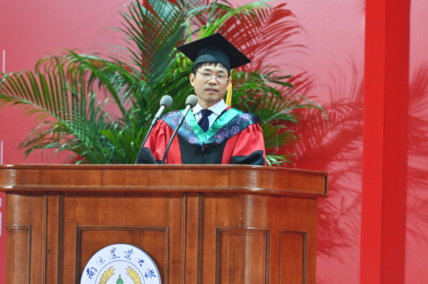 陈发棣以《做一粒种子开理想之花》寄语毕业生。梦起春程、山河夏盛、学丰秋实、冬藏新盼,陈发棣和同学们一起回顾了在母校寒来暑往的四年时光。他寄语同学们做向上生长的种子,开出信仰之花,无论身在何方、身从何事、身居何位,都胸怀国家事,肩扛国家责。他希望同学们做向下扎根的种子,开出理想之花,一步一个脚印,做理想的事业,在事业中成就理想。他鼓励同学们做向外求索的种子,开出奋斗之花,到时代变革的最前沿和科技创新的最前端,锤炼过硬本领,建功新时代,筑梦强国路。他勉励同学们做向内丰盈的种子,开出梦想之花,相信热爱的力量,相信梦想的力量,坚定志向,行稳致远,坚守心中的纯粹和热爱。