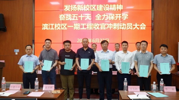 6月23日上午,滨江校区召开以发扬新校区建设精神、“奋战五十天 全力保开学”为主题的一期工程收官冲刺动员大会。校党委副书记、新校区建设指挥部总指挥刘营军出席并讲话,强调各方要统一思想、凝聚共识,调动一切积极力量,鼓足干劲大干五十天,顺利实现保搬迁投用目标任务。