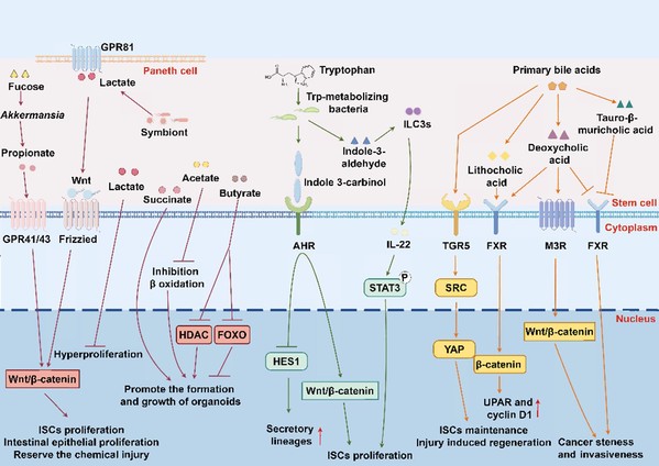 图2:肠道微生物关键代谢产物对ISC的影响以及调控肠道稳态的途径