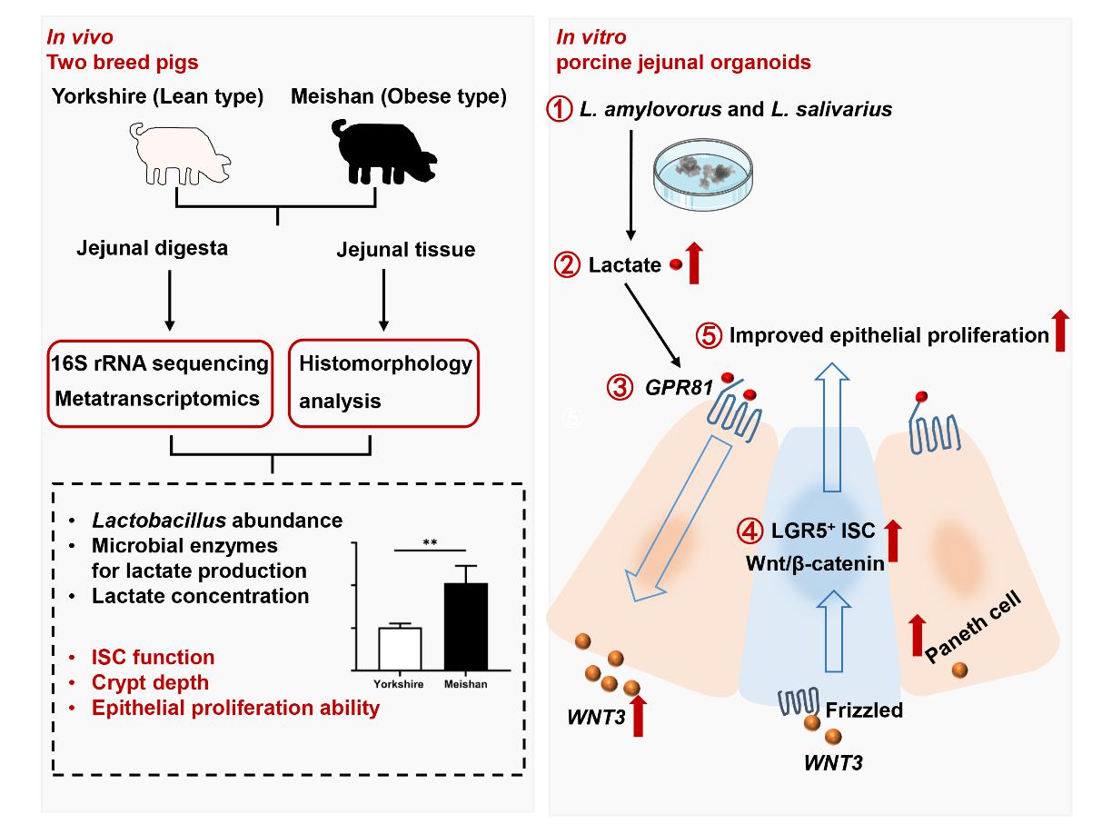 该研究利用遗传上存在显著差异的猪品种(肥胖型梅山猪和瘦型约克夏猪),揭示了猪种间空肠微生物组成和功能的差异。研究发现,梅山猪空肠中富集了更多活跃的Lactobacillus,尤其是优势的嗜淀粉乳杆菌(L. amylovorus)。L. amylovorus主导的种间微生物差异与肠上皮功能差异相一致,表现为与约克夏猪相比,梅山猪空肠中乳酸受体GPR81高表达,ISC增殖能力和促增殖信号通路Wnt/β-catenin的转录活性更强。通过本实验室建立的猪空肠类器官模型,该研究进一步揭示了L. amylovorus及其代谢产物乳酸促进猪肠道类器官增殖的具体机制:L. amylovorus和乳酸通过GPR81依赖的方式激活Wnt/β-catenin信号通路,从而促进ISC介导的肠上皮增殖,而热灭活的L. amylovorus则未能引起这些变化。以上结果首次揭示了L. amylovorus通过乳酸-GPR81-Wnt/β-catenin轴调节空肠干细胞功能,这一关键机制介导了猪种间肠道微生物组异质性以及ISC功能的差异。该研究强调了肠道微生物组与ISC互作在遗传因素影响肠道上皮功能中的重要性,为深入理解肠道微生物组如何调控肠道稳态提供新见解。