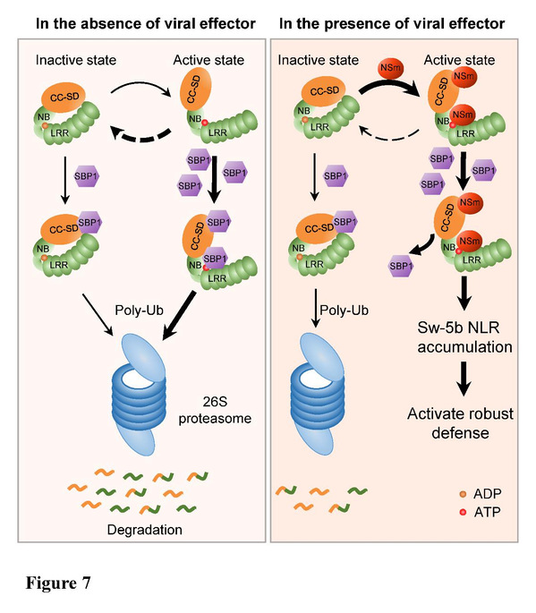 本研究对番茄Sw-5b NLR免疫受体和番茄斑萎病毒效应蛋白NSm的互作的深入研究发现寄主植物E3泛素连接酶SBP1与Sw-5b互作并介导其降解,而病毒效应蛋白NSm可以阻断NLR免疫受体Sw-5b的蛋白降解并激活强烈的免疫反应。在没有病毒效应蛋白时,植物E3泛素连接酶SBP1可以与Sw-5b 的N端SD结构域相互作用并介导抑制态Sw-5b NLR蛋白缓慢降解。Sw-5b自激活则促使E3泛素连接酶SBP1表达量升高,同时SBP1可以与激活态Sw-5b的N端SD与NB-LRR两个结构域同时互作,进而介导激活态Sw-5b的快速降解。当病毒效应蛋白NSm存在时,NSm能够干扰Sw-5b与SBP1的互作,从而促进激活态Sw-5b的蛋白积累,进而激活强烈的抗病毒免疫反应。研究结果为NLR受体在识别效应蛋白之后如何从低水平的蛋白积累转换到足够的蛋白积累进而诱导强烈的免疫反应提供了新的认识。