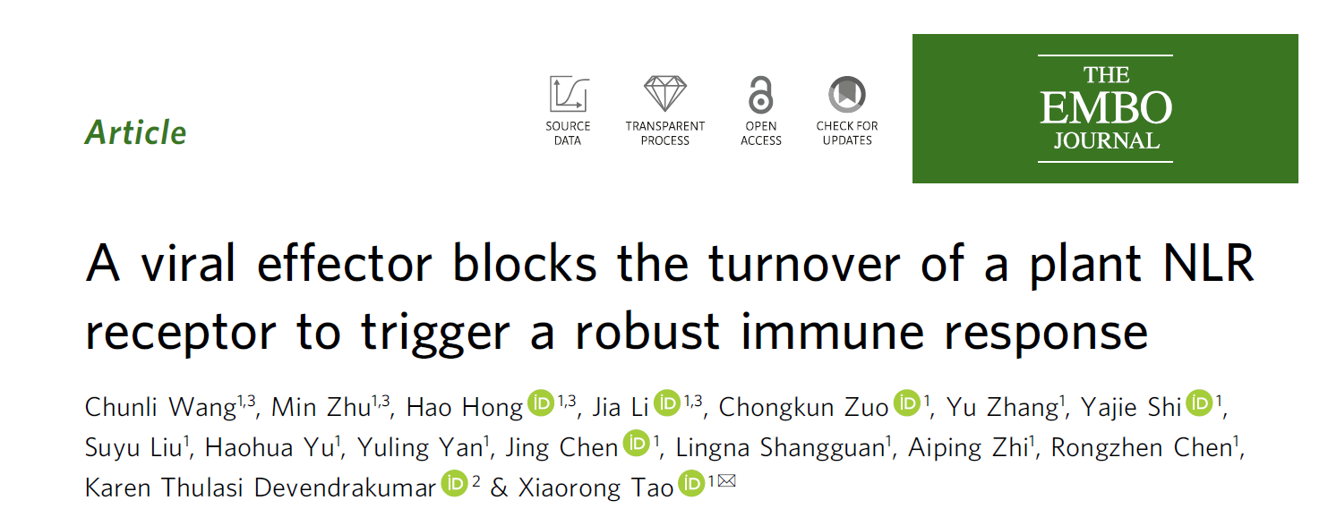 近日,我校植物保护学院陶小荣教授领衔的植物病毒学团队在The EMBO Journal上发表了题为《A viral effector blocks the turnover of a plant NLR receptor to trigger a robust immune response》的研究论文。植物对病原微生物的防御依赖于细胞内含核苷酸结合域富亮氨酸重复的免疫受体(NLRs),NLRs的蛋白积累受到非常严格的调控。然而,低水平的NLRs免疫受体如何在病原微生物侵染时激活强烈的免疫反应到目前为止仍知之甚少。该研究发现番茄斑萎病毒侵染时,病毒效应蛋白NSm可以阻断植物NLR免疫受体Sw-5b的降解并激活强烈的抗病毒免疫,研究结果对植物免疫受体蛋白稳态与抗性激活动态调控机制方面提供了新的认知。
