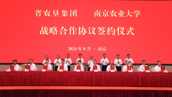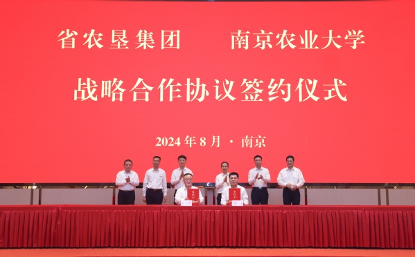 8月9日,我校与江苏省农垦集团签署战略合作协议。我校党委书记王春春,校长陈发棣,党委副书记吴荣顺,副校长单正丰,农垦集团公司党委书记、董事长吴本辉,党委副书记、总经理姜建友,党委副书记朱浩,党委委员、副总经理王立新出席签约仪式。