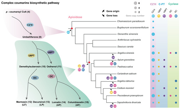 图1. 伞形科复杂香豆素生物合成通路中关键酶基因起源与丢失的总结示意图