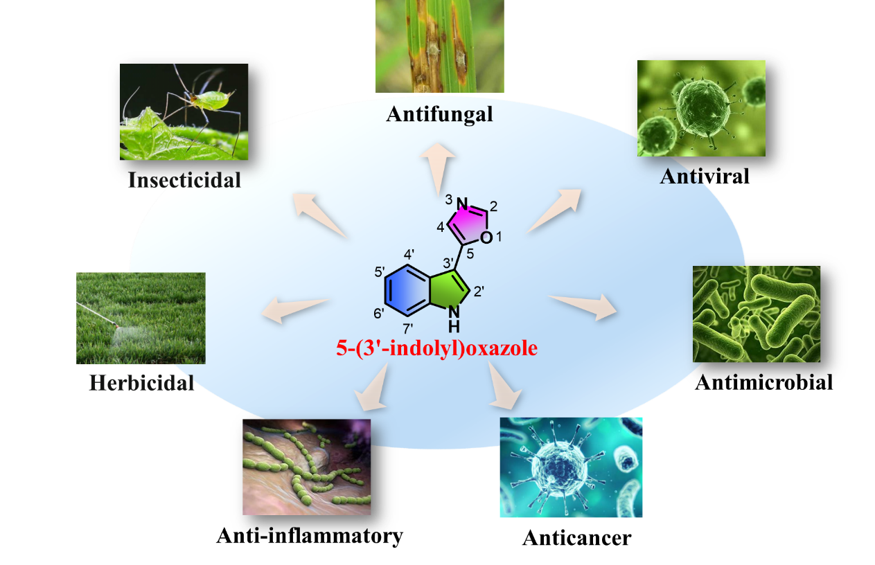 5-(3’-吲哚基)噁唑结构是一种独特的杂环骨架,存在于许多海洋天然产物和潜在的药物先导结构中。含有这种骨架的化合物,无论是天然源分离获取的,还是人工合成的衍生物,都表现出广泛的生物活性,例如Pimprinine (皮普利宁)和Streptochlorin (氯链素)两种天然产物都具有抗真菌和抗细菌活性,除此之外,皮普利宁表现出抗病毒和抗氧化活性,氯链素具有抗癌和抗炎活性。文章对含有5-(3’-吲哚基)噁唑结构的化合物包括抗癌、抗菌、抗病毒、抗氧化和抗炎等在内的众多生物活性进行了详细总结,涵盖团队前期研究发现5-(3’-吲哚基)噁唑类化合物表现出优异的农用生物活性,包括抗植物病原真菌、除草和杀虫活性等。