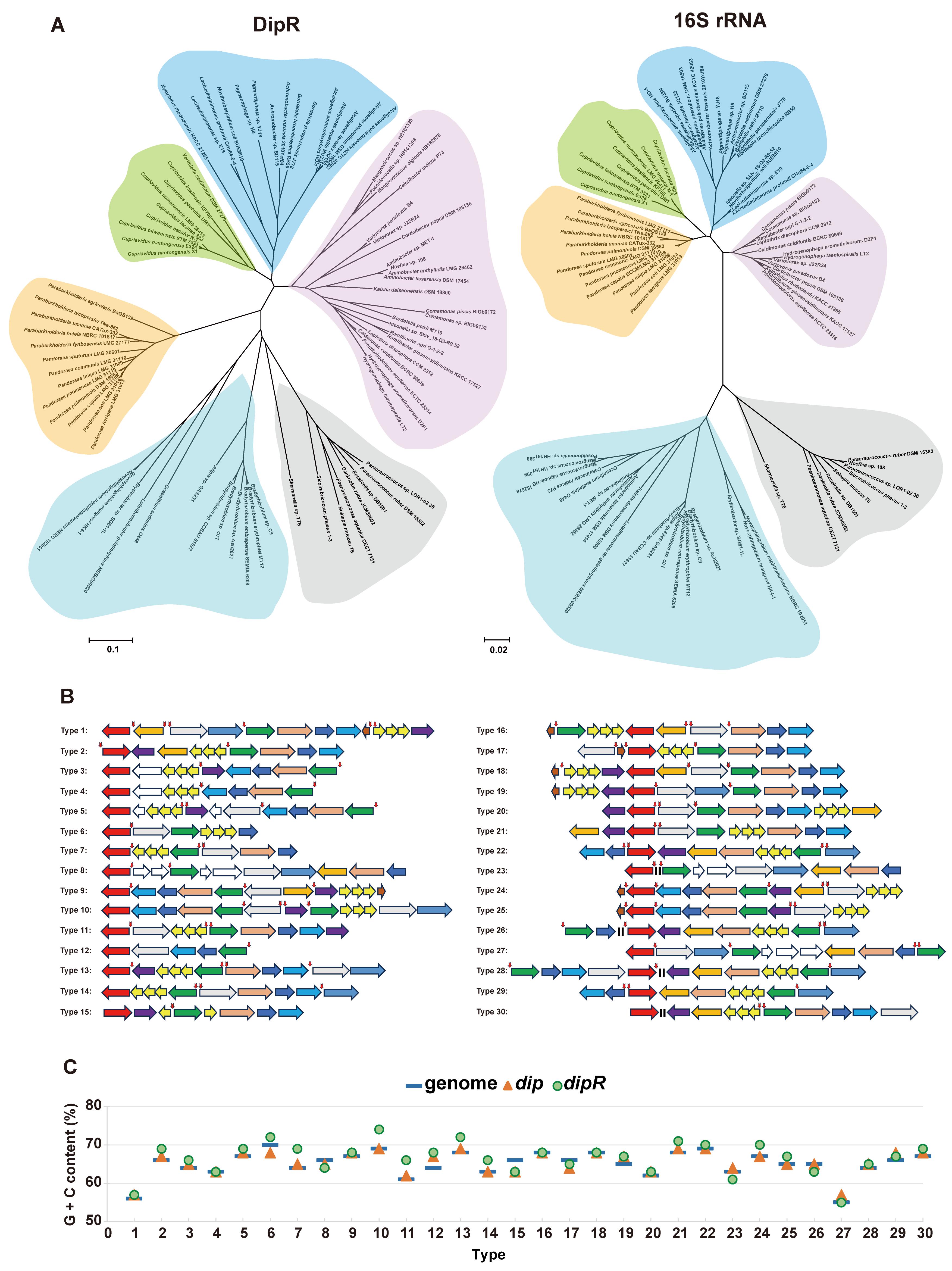 本研究以产碱杆菌Alcaligenes faecalisJQ135为材料,利用RT-PCR、5’-RACE、EMSA、DNaseI Footprinting和氨基酸定点突变等方法系统鉴定了DipR的功能,发现dip簇由dipR、dipA、dipBC、dipDEFG、dipH和dipJKLM等6个转录单元组成;DipR蛋白有6个结合位点共享6 bp保守序列5’-GWATAC-3’,且该序列是DipR结合所必需的;氨基酸残基R63、R67、H196和H218在DipR调控中发挥了重要作用;生物信息学分析表明dip簇广泛存在于39个属、80个种细菌中,并随宿主共进化。本研究揭示DPA降解及转录调控机制,为深入理解环境中微生物降解DPA的分子机制以及基于DPA的地球生物炭库物质循环提供新的理论基础。