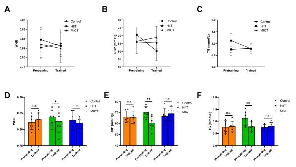 组别 × 时间对(A) WHR (腰围/臀围比);(B) DBP (舒张压);(C) TG (甘油三酯) 的显著交互效应