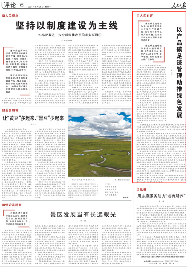 党的二十届三中全会《决定》提出,“构建碳排放统计核算体系、产品碳标识认证制度、产品碳足迹管理体系”。全方位、全链条、全过程推动碳足迹工作落细、落实、落地,不断健全绿色低碳发展机制,发展“含绿量”和生态“含金量”必将同步提升。
