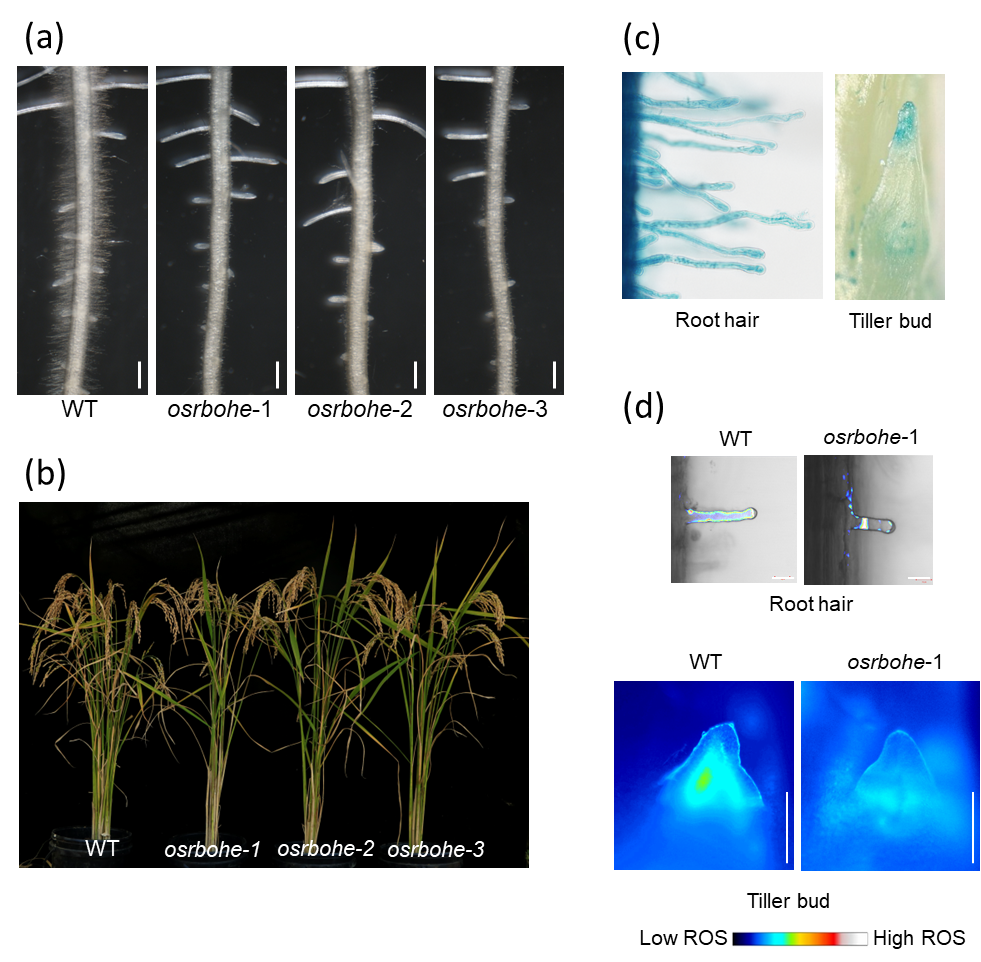图1. OsRBOHE影响水稻根毛形成和分蘖。敲除OsRBOHE基因减少根毛形成 (a) 和分蘖(b);(c)OsRBOHE启动子-GUS显示OsRBOHE在根毛和分蘖芽表达;(d)敲除OsRBOHE基因减少根毛和分蘖芽中活性氧(ROS)产生。