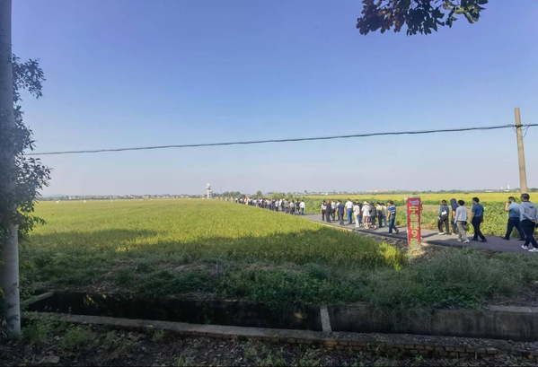 培训会开始前,参会人员来到溧阳市埭头镇葫芦村农业产业园,观摩“宁香粳9号”种植田。2024年,溧阳市农业农村局在埭头镇前六村进行了优质食味水稻新品种“宁香粳9号”示范种植,连片种植1000亩。目前,“宁香粳9号”示范区水稻正处于灌浆至乳熟期,理论产量预估 825公斤。来到示范种植田,一眼望去,千亩稻田丰收在望,植株清秀挺拔,叶姿优雅。ios版雷竞技官网江玲教授深入田间后脱口而出“非常震撼”。