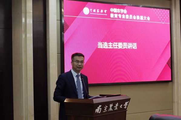 新当选主任委员陈发棣教授讲话,他充分肯定了第五届教专委的各项工作成绩,代表新一届教专委感谢上一届领导班子的出色工作。陈发棣指出,强国必先强农,强农教育优先,新一届教育专业委员会将提高政治站位,为强国建设担起时代重任;不断提高研究能力,为强国建设提供智力支撑;不断提高办会水平,为强国建设贡献教育力量。