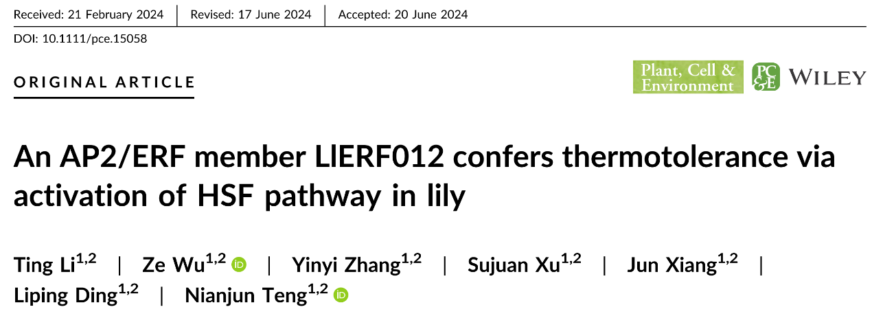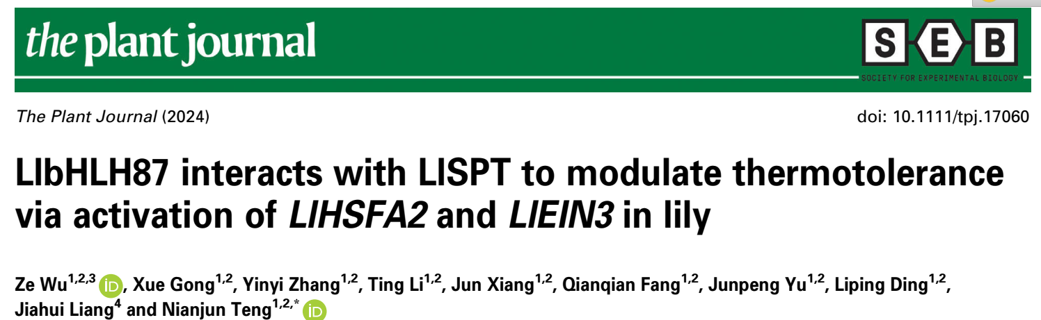近日,ios版雷竞技官网园艺学院滕年军教授团队分别在The Plant Journal和Plant, Cell and Environment发表了题为“LlbHLH87 interacts with LlSPT to modulate thermotolerance via activation of LlHSFA2 andLlEIN3in lily”和“An AP2/ERF member LlERF012 confers thermotolerance via activation of HSF pathway in lily”系列研究论文,揭示了bHLH类转录因子LlbHLH87和LlSPT互作拮抗调控百合耐热性的新机制,以及AP2/ERF转录因子LlERF012协同热激转录因子参与百合耐热性建立的新机制。