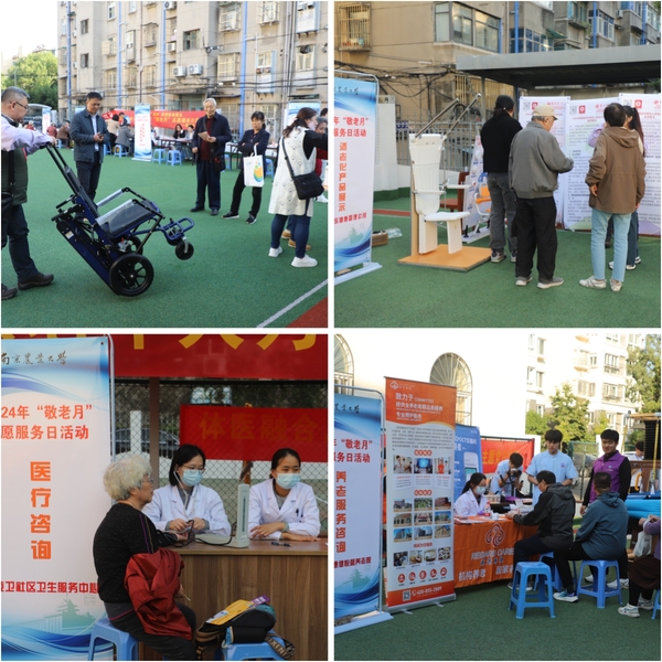 南京公证处家事法律服务中心、孝陵卫社区卫生服务中心的医疗团队、南京海天口腔门诊部、南京瑞芝康健悦馨养老院、太保家园南京国际颐养社区、南京三沐居家养老服务责任有限公司、上海佳年乐健康管理公司等10家校内外企事业单位积极参与其中,共同为老年朋友们提供了一站式、全方位的志愿服务。老年朋友们在展位前频频驻足,与服务人员进行互动交流,了解和体验个人需要的服务,感受来自社会各界的温暖和关怀。