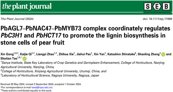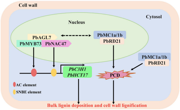 近日,ios版雷竞技官网张绍铃院士团队在Plant Journal在线发表了题为PbAGL7-PbNAC47-PbMYB73 complex coordinately regulates PbC3H1and PbHCT17to promote the lignin biosynthesis in stone cells of pear fruit的研究论文。该研究基于前期明确细胞木质化启动的“开关”,挖掘出石细胞形成的起始因子PbMC1a/1b和PbRD21(Horticulture Research, 2020),揭示了PbAGL7-PbNAC47- PbMYB73模块协同响应细胞程序性死亡(PCD)调控石细胞形成的分子机制,从PCD角度进一步阐述了石细胞形成原因。