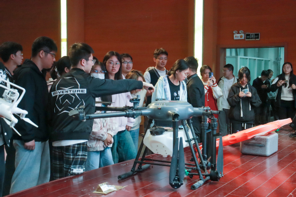 讲座结束后,同学们纷纷走向现场设置的实物展示区。邓海啸、钱燕团队研究生为同学们现场演示农用无人机的操作,分别就实验室选择、课业与科研的平衡及科研能力提升等问题与现场同学们进行互动交流,鼓励大家了解科研、投身科研,找到适合自己的科研之路。
