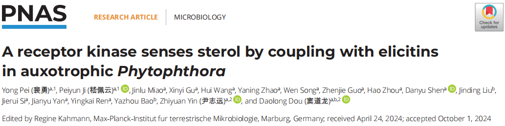 10月30日,ios版雷竞技官网植物保护学院窦道龙教授团队破解疫霉菌感知利用寄主甾醇的独特机制。相关文章“A receptor kinase senses sterol by coupling with elicitins in auxotrophic Phytophthora”发表在《PNAS》期刊。