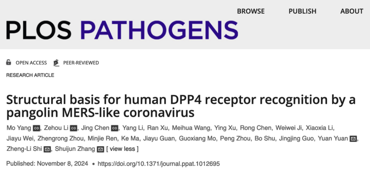 11月8日,《PLOS Pathogens》在线发表了题为《Structural basis for human DPP4 receptor recognition by a pangolin MERS-like coronavirus》(一株穿山甲MERS样冠状病毒识别人DPP4受体的结构基础)的研究论文,报道了我校生命科学学院张水军教授课题组、中国科学院武汉病毒研究所石正丽研究员团队与安徽大学生命科学学院袁园副教授合作在穿山甲冠状病毒(MjHKU4r-CoV-1)跨物种识别受体机制方面的研究成果。