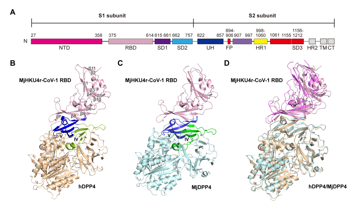 冠状病毒的跨物种传播对全球公共卫生构成了重大威胁。冠状病毒属的很多成员可以跨物种感染人和动物,包括新型冠状病毒(SARS-CoV-2)、SARS冠状病毒(SARS-CoV)和中东呼吸综合征冠状病毒(MERS-CoV)等。2023年,石正丽研究员团队在马来穿山甲中发现了一种新型MERS样冠状病毒,命名为MjHKU4r-CoV-1[1]。作为从蝙蝠中同类病毒(Ty-BatCoV-HKU4)演化而来的穿山甲冠状病毒,MjHKU4r-CoV-1能够利用蝙蝠、穿山甲或人类的二肽基肽酶4(DPP4)作为入侵受体。MjHKU4r-CoV-1能够在人的类器官和人DPP4转基因小鼠中引发感染,因此存在感染人类的风险[1]。然而,MjHKU4r-CoV-1识别受体的机制尚不清楚,研究其与人、穿山甲的受体分子结合对于评估该病毒的跨物种感染潜能至关重要。