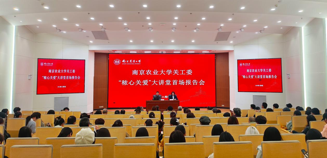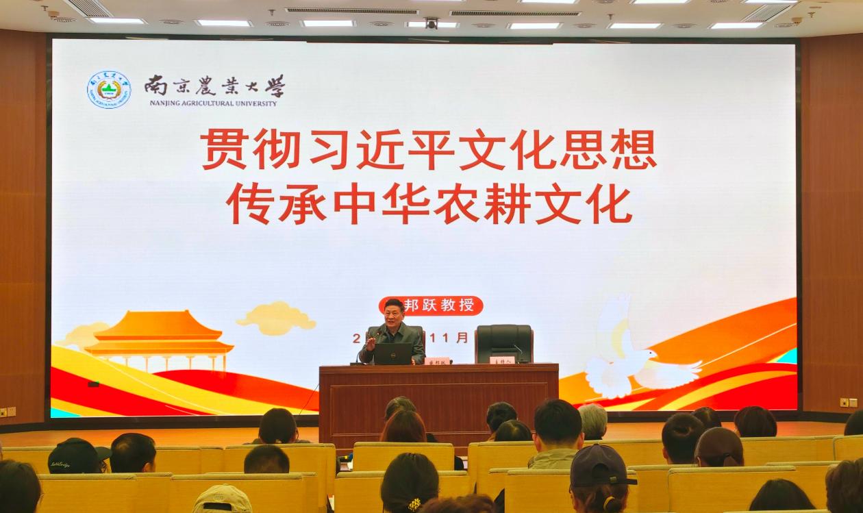 11月8日上午,校关工委“秾心关爱”大讲堂首场报告会在卫岗校区图书馆学术报告厅举行,校关工委常务副主任、江苏省教育系统关工委讲师团“双百专家库”首批成员、博士生导师盛邦跃作题为《学习贯彻习近平文化思想,传承中华农耕文化》的报告。