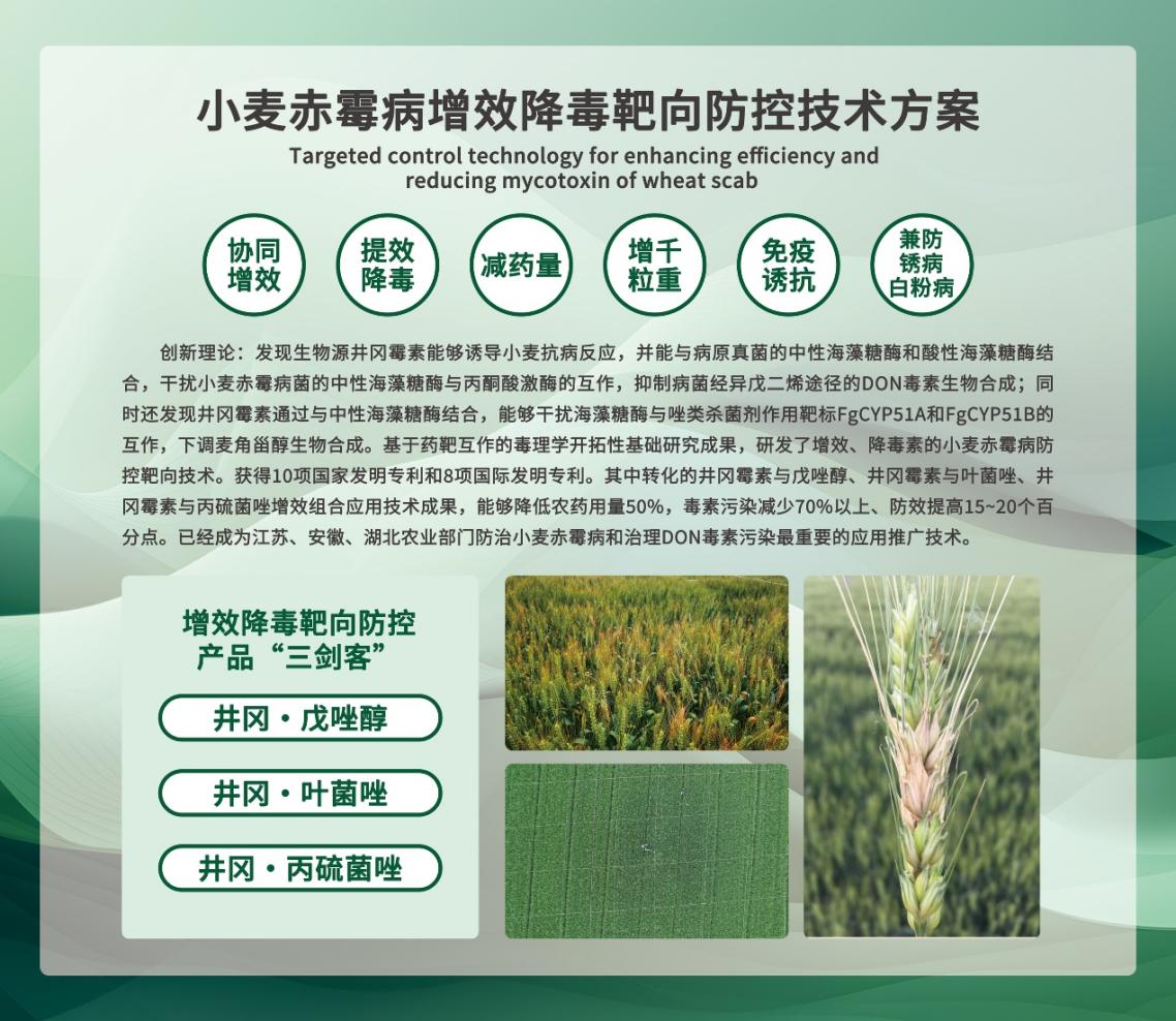 周明国教授与段亚冰教授团队的研究成果“小麦赤霉病增效降毒靶向防控技术”入选成果库。该研究基于井冈霉素和唑类杀菌剂毒理学机制的基础理论成果,研发了降低赤霉病菌毒素合成、兼治多种麦类作物病害、促进小麦健康生长和增加千粒重等技术于一身的系列靶向抑制毒素和甾醇合成的生物-化学协同增效产品,是基础理论研究与应用技术研发紧密衔接的典型案例,解决了我国小麦病害防治技术单一、用工用药成本高、抗药性发生快、产品寿命短、市场竞争力低等问题,提升了我国麦类病害综合防控的科技水平。目前该技术已获得8项国际发明专利及10项国内发明专利,成果转化3项,进入市场后将表现出极强的竞争力和较长的使用寿命,预计年均销售额将突破亿元,将成为江苏及华东麦区示范推广防控小麦赤霉病和控制毒素污染的关键技术,在保障小麦生产安全、食品安全和环境安全方面具有重要的理论意义和应用价值。