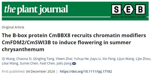 “飒飒西风满院栽,蕊寒香冷蝶难来”。菊花(Chrysanthemum morifolium)是世界重要盆栽、切花和地被花卉,具有很高的观赏和经济价值,在花卉产业中具有重要的地位。菊花多为短日照品种,于秋季开放。夏菊属于光周期不敏感类型,在长短日照下均可开花,但目前品种较少,开花机理也不清楚。团队前期发现CmFTL1是夏菊‘优香’在长日照条件下的开花素,且被B-box蛋白CmBBX8直接转录调控(Plant Biotechnology Journal 2020);CmBBX8同一亚家族成员CmBBX7在调控夏菊开花中也发挥了重要作用,和CmBBX8协同促进CmFTL1的表达,在加速开花过程中起着“涡轮增压”的作用(Molecular Horticulture 2023)。夏菊为了防止过早开花,保证正常营养生,CmRCD1、CmERF3及CmBBX5分别通过抑制CmBBX8的转录活性和(或)其结合CmFTL1的启动子能力抑制开花(Horticulture Research 2021;Plant Cell and Environment 2023,2024)。因此,夏菊‘优香’设置了多种开花‘刹车’方式,以防止在不成熟时过早开花导致的品质不良。