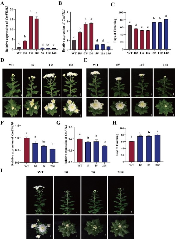 首先以CmBBX8超表达植株为实验材料,通过IP-MS分析筛选出可能与CmBBX8互作的表观修饰因子CmFDM2,然后通过体内体外试验验证CmBBX8与CmFDM2互作。为了明确CmFDM2基因的功能,创制超表达和人工干扰转基因菊花株系。相比较野生型,超表达株系提前开花8-14 d,人工miRNA干扰株系延迟开花8-17 d(图1A-E)。通过酵母单杂交实验发现CmFDM2能结合在CmFTL1启动子上,烟草和菊花原生质体Dual-LUC试验表明CmFDM2会促进CmFTL1的表达。进一步在体内体外验证CmFDM2会与染色质重塑因子CmSWI3B互作,CmSWI3B 与CmBBX8互作。为了明确CmSWI3B基因的功能,创制人工干扰菊花株系。相比较野生型,人工miRNA干扰株系延迟开花19-25 d(图1F-I)。