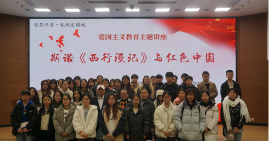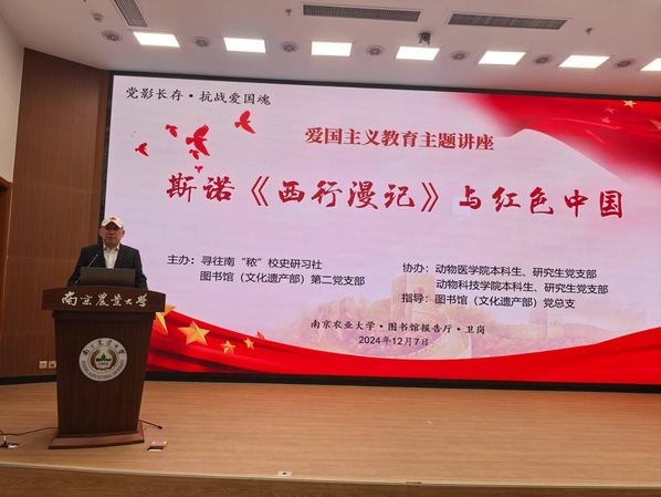 12月7日,在抗日救国一二·九运动89周年来临之际,为进一步弘扬爱国主义精神,深入学习党的历史,继承和发扬爱国主义精神,图书馆(文化遗产部)邀请到南京民间抗日战争博物馆馆长吴先斌来馆做爱国主义教育主题讲座“斯诺《西行漫记》与红色中国”。寻往南“秾”校史研习社成员、图书馆(文化遗产部)第二党支部党员、以及来自动物医学院学生党支部、动物科技学院学生党支部的学生党员等师生参加讲座。