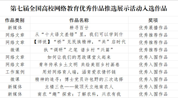 近日,第七届全国高校网络教育优秀作品推选展示活动获奖情况发文公示。我校10项作品入选获奖名单,学校荣获第七届全国高校网络教育优秀作品推选展示活动优秀组织奖。其中,微视频《耕寻百廿》、微课《执“调研”之笔 谱乡村“兴篇”》、网络文章《如何让我们的思政课堂也像<新龙门客栈>一样火起来》等4项作品入选江苏省思政工作资源库。
