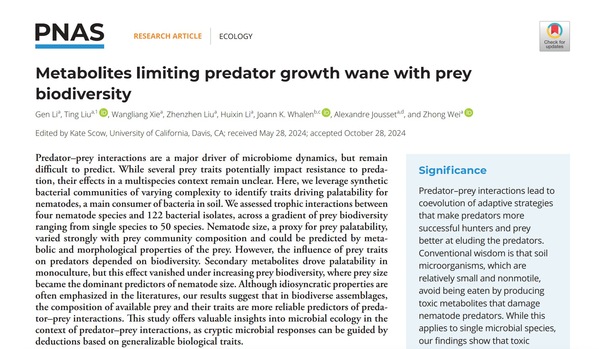 近日,ios版雷竞技官网资源与环境科学学院揭示了微生物多样性如何塑造捕食者体型大小的生态学机制,挑战了传统微型生态系统中捕食-被捕食关系以毒性为主导的假说。相关成果以题为“Metabolites limiting predator growth wane with prey biodiversity”发表在国际权威期刊《PNAS》(www.pnas.org/doi/10.1073/pnas.2410210121)。