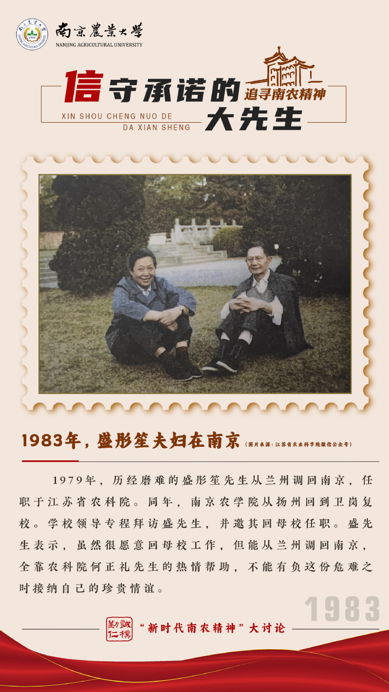1979年,历经磨难的盛彤笙先生从兰州调回南京,任职于江苏省农科院。同年,南京农学院从扬州回到卫岗复校。学校领导专程拜访盛先生,并邀其回母校任职。盛先生表示,虽然很愿意回母校工作,但能从兰州调回南京,全靠农科院何正礼先生的热情帮助,不能有负这份危难之时接纳自己的珍贵情谊。