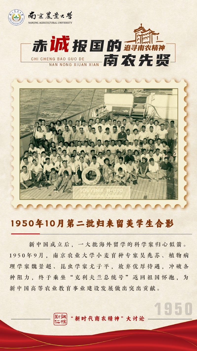 1950年9月,航行在太平洋的“克利夫兰总统号”上,有一批怀抱报国理想的科学家,南京农学院小麦育种专家吴兆苏、植物病理学家魏景超、昆虫学家尤子平就在其中。新中国成立后,一批身在海外的南农先贤放弃优厚待遇,冲破各种阻力,重返祖国怀抱,为新中国高等农业教育事业建设发展作出了突出贡献。