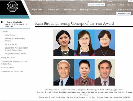 2015年度美国农业及生物工程师学会年会在美国新奥尔良举行。我校青年教师顾家冰与美国农业部农业工程研究中心(USDA-ARS-ATRU)首席科学家Heping Zhu的合作项目“Laser-Guided Intelligent Sprayer for Nursery, Orchard and Grape Applications”荣获该学会颁发的“2015年雨鸟年度最佳工程概念奖”。顾家冰成为自1974年该奖项设立以来首次获此殊荣的中国科研人员。