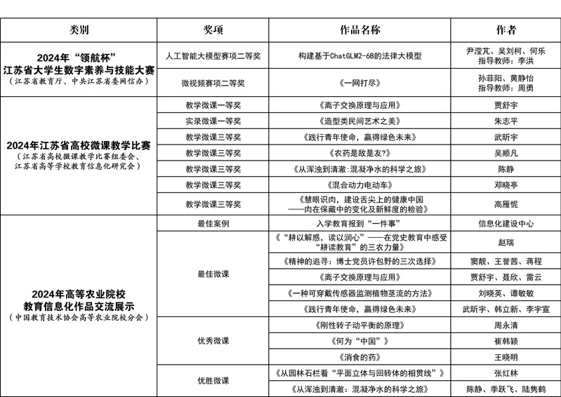 近日,江苏省教育厅、中共江苏省委网信办、江苏省高校微课教学比赛组委会和中国教育技术协会高等农业院校分会公布了2024年教育教学信息化作品获奖名单,我校共有20项作品入选并获奖。