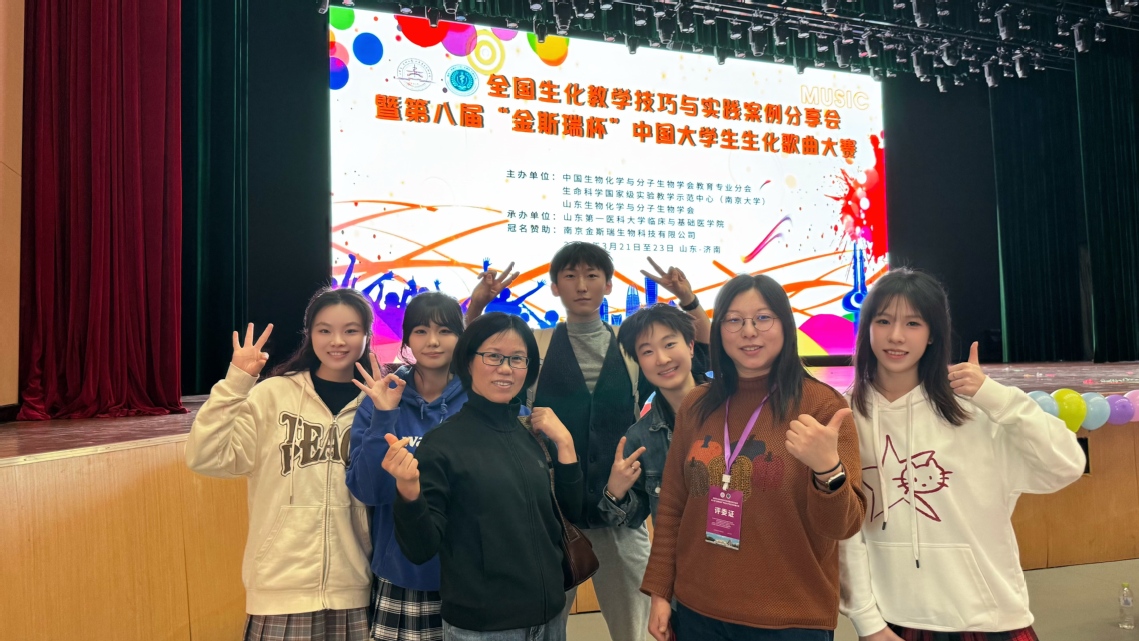 3月22日,由中国生物化学与分子生物学会教育专业分会、山东生物化学与分子生物学会等主办的第八届“金斯瑞杯”中国大学生生化歌曲大赛在山东第一医科大学举行,ios版雷竞技官网生命科学学院“脂类代谢工厂”团队以一曲改编版《Three steps》惊艳全场,从全国71所高校的73部作品中脱颖而出,一举夺得全国一等奖。