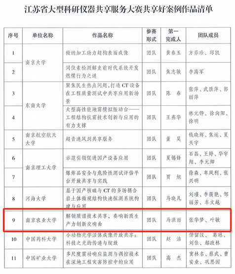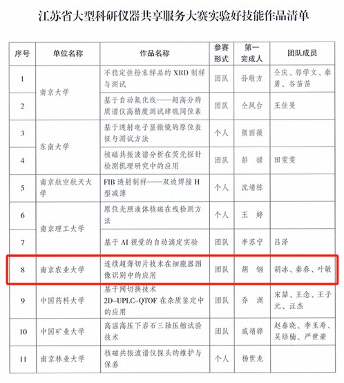 3月28日,江苏省科技资源统筹服务中心公布首届“江苏省大型科研仪器共享服务大赛”获奖名单,我校现代农业分析测试中心作品“连续超薄切片技术在细胞器图像识别中的应用”入选江苏省大型科研仪器共享服务大赛实验好技能作品;“解锁质谱技术共享,奏响新质生产力创新交响曲”入选江苏省大型科研仪器共享服务大赛共享好案例作品。本次大赛由江苏省科技资源统筹服务中心主办,东南大学、南京理工大学、南京信息工程大学联合承办。